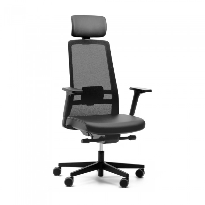 Double może być wyposażony w podłokietniki z regulacją we wszystkich kierunkach oraz ergonomiczny zagłówek tapicerowany skórą lub wysokogatunkową tkaniną.